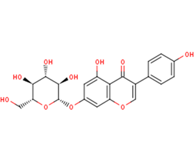 DescriptionGenistin is a selective estrogen receptor modulator (SERM) found in soy. It is the less active glycoside analog of genistein. It acts as a phytoestrogen, induces cell cycle arrest and apoptosis in ovarian cancer cells, improves bone density and strength, and decreases myosin light chain kinase levels.