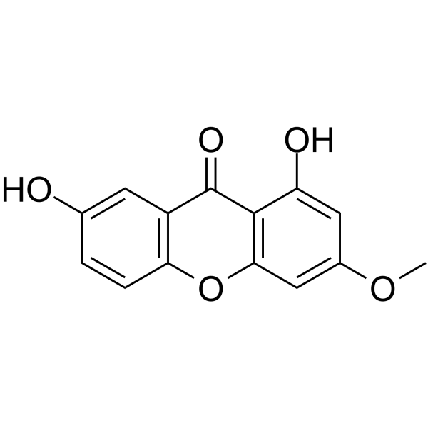 DescriptionGentisin is a novel inhibitor of vascular smooth muscle cells (VSMC) proliferation with an IC50 value of 7.84 μM. Gentisin has mutagenic activity.(In Vitro):The anti-proliferative effect of Gentisin was confirmed by the quantification of DNA synthesis (BrdU incorporation) in VSMC. Cell death quantification (determined by LDH release in the culture medium) revealed that Gentisin was not cytotoxic in the investigated concentration range.