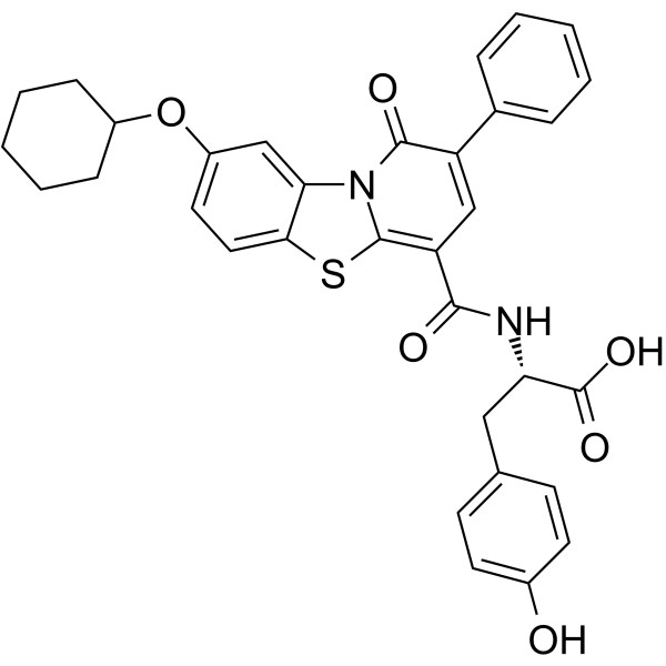 DescriptionHeE1-2Tyr, a pyridobenzothiazole compound, is a flavivirus RNA dependent RNA polymerases (RdRp) inhibitor. It significantly inhibits West Nile, Dengue and SARS-CoV-2 RdRps (IC50 of 27.6 μM) activity in vitro.