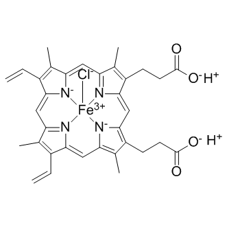 DescriptionHemin, a physiological erythroid maturation stimulator, is able to induce the expression of critical autophagic genes (Map1a1b (LC3), Beclin-1 gen, Atg5) in an erythroleukemia cell type; increases the size of autophagic vacuoles and induces mitophagy in K562 cells; a heme oxygenase (HO)?1 inducer.(In Vitro):Hemin and PGJ2, used as positive controls, strongly increase both expression and activity of HMOX after 4 and 12 h, respectively. Indeed, a significant effect is found of 30 μM Hemin on cell proliferation in all used cell lines after 48 h, which is dose-dependent. Hemin treatment decreases cell proliferation to 62±5 %, 51±3 %, and 38±8 % in PA-TU-8902, BxPC-3 and MiaPaCa-2 cancer cells, respectively, with p<0.0001 for all comparisons. Furthermore, enhancement of anti-proliferative effects of statins is observed by Hemin, documented as decreased cell proliferation after 48 h of co-treatment. (In Vivo):Following the i.p. administration of Hemin (100 μmol/kg), the HO-1 level in the renal cortex begins to increase gradually. The HO-1 level reaches its peak 24 h after Hemin preconditioning. HO-1 is expressed mainly in the renal tubules. The HO-2 level in the kidney does not change following Hemin preconditioning.