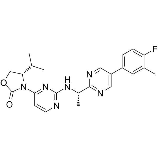 SMILESCC(C)[C@H]1COC(=O)N1c1ccnc(N[C@@H](C)c2ncc(cn2)-c2ccc(F)c(C)c2)n1