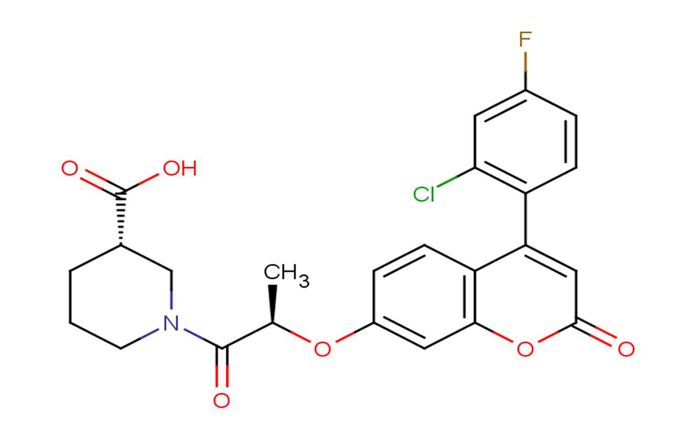 Synonyms3-Piperidinecarboxylic acid, 1-[(2R)-2-[[4-(2-chloro-4-fluorophenyl)-2-oxo-2H-1-benzopyran-7-yl]oxy]-1-oxopropyl]-, (3S)- | LDC203974