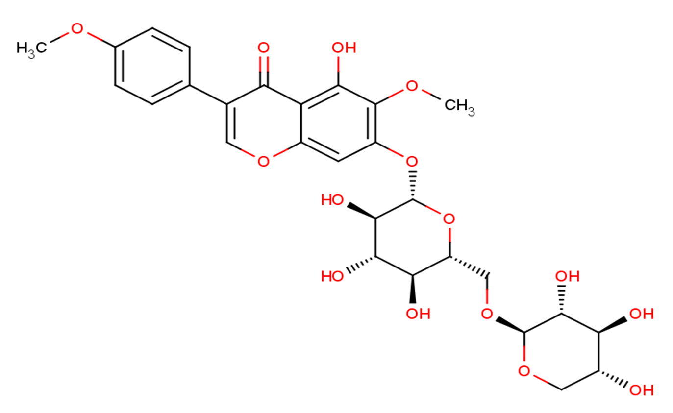 SMILESO=C1C2=C(O)C(OC)=C(O[C@@H]3O[C@@H]([C@@H](O)[C@H](O)[C@H]3O)CO[C@H]4[C@@H]([C@H]([C@H](O)CO4)O)O)C=C2OC=C1C5=CC=C(OC)C=C5
