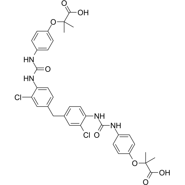 SMILESCC(C)(Oc1ccc(NC(=O)Nc2ccc(Cc3ccc(NC(=O)Nc4ccc(OC(C)(C)C(O)=O)cc4)c(Cl)c3)cc2Cl)cc1)C(O)=O