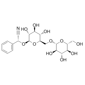 DescriptionLaetrile is a glycoside initially isolated from the seeds of the tree Prunus dulcis, also known as bitter almonds.(In Vitro):Amygdalin has antitumor activity. Some advances had been made on the antitumor mechanism of amygdalin. Amygdalin downregulates especially genes belonging to cell cycle category: exonuclease 1, ATP-binding cassette, sub-family F, member 2, MRE11 meiotic recombination 11 homolog A, topoisomerase (DNA) I, and FK506 binding protein 12-rapamycin-associated protein 1. RT-PCR analysis reveals that mRNA levels of these genes are also decreased by amygdalin treatment in SNU-C4 human colon cancer cells.(In Vivo):Amygdalin is effective at alleviating inflammatory pain and that it can be used as an analgesic with anti-nociceptive and anti-inflammatory activities. The intramuscular injection of amygdalin significantly reduced the formalin-induced tonic pain in both early (the initial 10 min after formalin injection) and late phases (10-30 min following the initial formalin injection). During the late phase, amygdalin reduces the formalin-induced pain in a dose-dependent manner in a dose range less than 1 mg/kg.
