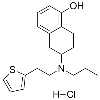 DescriptionA non-selective agonist of the dopamine D3 receptor (Ki=0.71 nM); has 10-fold selectivity for the D3 receptor over the D2, D4, and D5 receptors and 100-fold selectivity for the D3 receptor over the D1 receptor; behaves as a full agonist of D1, D2, and D3 with similar potencies (EC50) in functional assay; also demonstrates significant affinity at α-adrenergic (α2B, Ki=27 nM) and serotonin receptors (5-HT1A Ki=30 nM); significantly attenuates MPTP-induced acute cell degeneration in mouse model.Parkinson's Disease Approved.