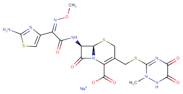 SMILESCN1C(=NC(=O)C(=O)N1)SCC2=C(N3[C@@H]([C@@H](C3=O)NC(=O)/C(=N\OC)/C4=CSC(=N4)N)SC2)C(=O)[O-].[Na+]