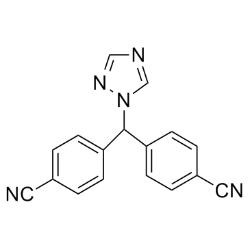DescriptionLetrozole (INN, trade name Femara) is an oral non-steroidal aromatase inhibitor that has been introduced for the adjuvant treatment of hormonally-responsive breast Y Estrogens are produced by the conversion of androgens through the activity of the aromatase enzyme. (In Vitro):Letrozole (0.1-100 nM; 24-96 h) significantly inhibits growth of the MCF-7 epithelial breast cancer cells in a dose- and time-dependent manner.Letrozole (10 nM) significantly suppresses the stimulatory effects of testosterone on MCF-7 cell proliferation.Letrozole (10 nM; 24-48 h) suppresses the levels of secreted metalloproteinases (MMP‐2 and MMP‐9) in MCF-7 cells(In Vivo):Letrozole (3-300 μg/kg; oral gavage once daily for 6 weeks) exhibits anti-tumor effects in rats.