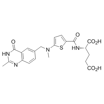 DescriptionA quinazoline antifolate thymidylate synthase (TS) inhibitor with Ki of 62 nM; inhibits TS with IC50 of 2.5 nM and L1210 tumor cell growth with IC50 of 8 nM; acitve in vivo.Chemotherapeutic Agents Approved(In Vitro):Raltitrexed inhibits HepG2 proliferation by arresting the cell cycle at G0/G1, and the cell cycle is mediated via downregulation of cyclin A and CDK2. Raltitrexed (0.1, 0.5, 2.5 μg/mL) decreases the viability of SGC7901 cells in a dose- and time-dependent manner. Raltitrexed (0.5 μg/mL) shows typical apoptotic morphology, including nuclear shrinkage, fragmentation, chromatin condensation and apoptotic bodies in SGC7901 cells. Raltitrexed blocks the cell cycle at the G0/G1 phase, decreases in the mitochondrial membrane potential. Raltitrexed also increases the level of ROS, induces caspase-3-dependent apoptosis via activation of the mitochondria, and increases TS protein and mRNA expression levels. Raltitrexed (1.5 nM) reduces the number of GM00637 cells, selectively induces gene conversions, but does not affect DSB-induced HR or NHEJ.(In Vivo):Raltitrexed (0, 5, 10, 11.5, 13.5, 15 mg/kg b/w, i.p.) increases the rates of resorbed embryos and growth retardation of murine model of NTDs in a dose dependent manner. Raltitrexed (11.5 mg/kg b/w) maximally inhibits the thymidylate synthase (TS) activity in embryonic tissue, decreases dTMP levels and while increases dUMP levels.