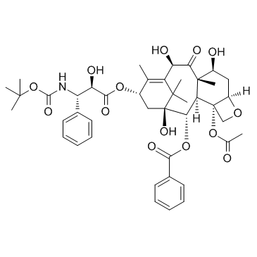 DescriptionDocetaxel is a clinically well established anti-mitotic chemotherapy medication used mainly for the treatment of breast, ovarian, and non-small cell lung Y. Docetaxel binds to microtubules reversibly with high affinity and has a maximum stoichiometry of one mole docetaxel per mole tubulin in microtubules. (In Vitro):Docetaxel (RP-56976) and Glufosfamide (GLU) single and combined treatments affect the cells viability in a dose-dependent manner. The IC50 of GLU are 70±4 μM and 86.8±8 μM in PC-3 and LNCaP cells; respectively. While, the IC50 of Docetaxel alone is found to be 3.08±0.4 nM and 1.46±0.2 nM in PC-3 and LNCaP cells; respectively.The co-treatment of GLU with Docetaxel is found to synergize the cytotoxicity and the IC50 values are decreased to be 2.7±0.1 nM and 0.75±0.3 nM in PC-3 and LNCaP cells; respectively.IC50 of NCI-H460 to Docetaxel at 24 h is 116 nM and at 72 h is 30 nM. According to data reported in DTP Data Search, the mean IC50 of NCI-60 cell panel to Docetaxel is 14-34 nM.(In Vivo):In female mice, the Docetaxel (RP-56976)-induced intestinal apoptosis in the 14-hours after light on (HALO) group is significantly greater than that in the 2-HALO group. Bax expression is significantly elevated by Docetaxel in the 2-HALO group, but not in the 14-HALO group. On the other hand, cleaved Caspase-3 expression is significantly elevated by Docetaxel in the 14-HALO group, but not in the 2-HALO group. The expressions of Wee1 and phosphorylated CKD1 are significantly elevated after dosing of Docetaxel at 14 HALO, but not at 2 HALO. In addition, Docetaxel significantly reduces survivin expression in the 14-HALO group but not in the 2-HALO group. The survivin expression level in the Docetaxel-treated 14-HALO group is significantly smaller than that in the drug-treated 2-HALO group.Piperine (PIP) is administrated via intravenous bolus at 3.5 mg/kg and via oral administration at 35 mg/kg and 3.5 mg/kg, while Docetaxel (DOX) is intravenously administrated at 7 mg/kg to Sprague-Daley rats. The co-administrations of PIP at 35 mg/kg via oral administration and Docetaxel at 7 mg/kg via intravenous bolus administration in Sprague-Dawley rats. The combination use of PIP and Docetaxel results in a synergic increase of both their in vivo exposure.