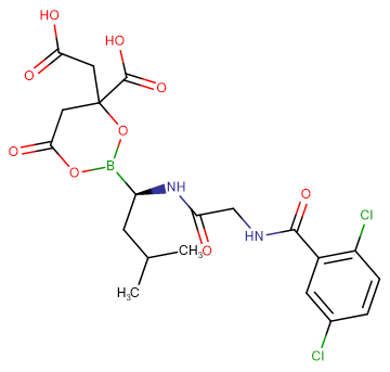 DescriptionMLN9708 immediately hydrolyzed to MLN2238, the biologically active form, on exposure to aqueous solutions or plasma. MLN2238 inhibits the chymotrypsin-like proteolytic (β5) site of the 20S proteasome with IC50/Ki of 3.4 nM/0.93 nM, less potent to β1 and little activity to β2. Phase 3.