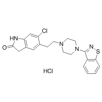 DescriptionA full antagonist of D2 and 5-HT2A receptors with Ki of 6.8 and 0.6 nM, respectively; also is a partial agonist of 5-HT1A, and a partial antagonist of 5-HT2C and 5-HT1D receptors; exhibits potent antipsychotic activity in vivo.Schizophrenia Approved(In Vitro):Ziprasidone hydrochloride (0-500 nM, 150 seconds) blocks wild-type hERG current.(In Vivo):Ziprasidone hydrochloride (oral gavage; 20 mg/kg; once daily; 7 weeks) results in weight loss, low level physical activity, high resting energy expenditure and greater capacity for thermogenesis when subjected to cold.