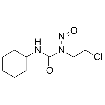 DescriptionLomustine is an Alkylating Drug. The mechanism of action of lomustine is as an Alkylating Activity.(In Vitro):Lomustine (CCNU; NSC 79037) is a DNA alkylating agent. Lomustine (CCNU, 0-250 μM) is cytotoxic to the U87-MG cells expressing tumor-derived mutant IDH1, and has little effect on the expression of wild-type IDH1. The combination of Lomustine and procarbazine or vincristine has no additive effect on the killing of cells expressing mutant or wild-type IDH1. Moreover, overexpression of either ALKBH2 or ALKBH3 partially reduces the death HT1080 cells exposed to Lomustine. Lomustine (CCNU) suppresses U87-MG growth with an ED50 of 68.1 μM. Lomustine (CCNU) (30, 40 μM) in combination with docosahexaenoic acid (DHA) darmatically inhibits 2 additional human-derived glioblastoma cell lines, and induces U87-MG apoptosis and necrosis. Lomustine (30 μM) causes G2/M arrest. Lomustine (CCNU) reduces the viability of F98 rat orthotopic glioma cells and Tu-2449 mouse glioma cell line, with IC50s of 20.8 μM and 18.6 μM, respectively.(In Vivo):Lomustine (CCNU; NSC 79037) (30 mg/kg) in combination with Toca 511 + 5-FC prolongs survival in rats bearing F98 tumor cells. Lomustine (CCNU) (30 mg/kg) combined with Toca-511 + 5-FC also exhibits antitumor activity in the B6C3F1 mice bearing Tu-2449 glioma cells.