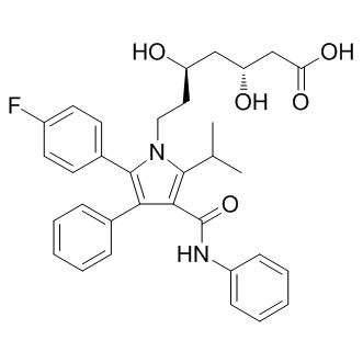 DescriptionA competitive inhibitor of HMG-CoA reductase that acts as a lipid-lowering agent for prevention of events associated with cardiovascular disease.Dyslipidemia Approved(In Vitro):Atorvastatin treatment decreases apoptosis of myocardial cells by down-regulating GRP78, caspase-12 and CHOP expression in myocardial cells after myocardial infarction, and the endoplasmic reticulum (ER) stress is activated in response to heart failure and angiotensin II (Ang II) stimulation.(In Vivo):Atorvastatin (20-30 mg/kg; oral gavage; once a day; for 28 days; ApoE / mice) treatment significantly reduces endoplasmic reticulum (ER) stress signaling proteins, the number of apoptotic cells, and the activation of Caspase12 and Bax in the Ang II-induced ApoE-/- mice. Proinflammatory cytokines such as IL-6, IL-8, IL-1β are all remarkably inhibited after Atorvastatin treatment.