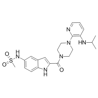 DescriptionA potent HIV-1 reverse transcriptase inhibitor with IC50 of 0.26 uM for recombinant HIV-1 RT; exhibits IC50>440 uM for DNA polymerases α and δ; blocks the replication in peripheral blood lymphocytes of 25 primary HIV-1 isolates and has low cellular cytotoxicity; retains significant activity against mutant RTs (K103N, Y181C).HIV Infection Approved(In Vitro):Delavirdine has an 50% cytotoxicity at concentrations >100 μM in H9 and PBMC cultures.Delavirdine has low cellular cytotoxicity, causing less than 8% reduction in peripheral blood lymphocyte viability at 100 μM.Delavirdine inhibits HIV-1 reverse transcriptase (RT) wild type with an IC50 value of 0.26 μM, and it inhibits Y181C-substituted RT and K103N-substituted RT with IC50 values of 8.32 uM and 7.7 uM, respectively.(In Vivo):Delavirdine (U 90152) (oral gavage; 10 mg/kg, 200 mg/kg, 250 mg/kg; single dose) is absorbed and metabolized rapidly, that it constitutes a minor component in circulation, that its pharmacokinetics are nonlinear, and that its metabolism to desalkyl delavirdine is capacity limited or inhibitable in CD-1 mice (PK study).