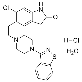DescriptionA full antagonist of D2 and 5-HT2A receptors with Ki of 6.8 and 0.6 nM, respectively; also is a partial agonist of 5-HT1A, and a partial antagonist of 5-HT2C and 5-HT1D receptors; exhibits potent antipsychotic activity in vivo.Schizophrenia Approved(In Vitro):Ziprasidone hydrochloride monohydrate (0-500 nM, 150 seconds) blocks wild-type hERG current.(In Vivo):Ziprasidone hydrochloride monohydrate (oral gavage; 20 mg/kg; once daily; 7 weeks) results in weight loss, low level physical activity, high resting energy expenditure and greater capacity for thermogenesis when subjected to cold.