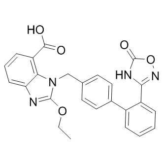 DescriptionA specific and potent angiotensin II type 1 receptor (AT1) antagonist with IC50 of 2.6 nM, used in the treatment of adults with essential hypertension. Hypertension Approved(In Vitro):Azilsartan (0-200 μM, 0-72 h) decreases the viability of HepG2 cells.Azilsartan (100 μM, 24 h) induces apoptosis in HepG2 cells.Azilsartan inhibits the specific binding of 125I-Sar1-Ile8-AII to human angiotensin type 1 receptors with an IC50 of 2.6 nM.Azilsartan potently inhibits aortic endothelial and vascular cell proliferation in the absence of exogenous Ang II supplementation.Azilsartan enhances adipogenesis and exerted greater effects than Valsartan (HY-18204) on expression of genes encoding peroxisome proliferator-activated receptor-α (PPARα), PPARδ, leptin, adipsin, and adiponectin.(In Vivo):Azilsartan (0-3 mg/kg, Oral gavage, once daily for 5 days) decreases SBP (systolic blood pressure) in obese Koletsky rats at 2 mg/kg.Azilsartan (0-2 mg/kg, Oral gavage, once daily for 21 days) lowers blood pressure and basal plasma insulin concentration.Azilsartan (2 and 4 mg/kg; PO, daily for 9 days) offers protection against ischemia induced secondary brain injury.