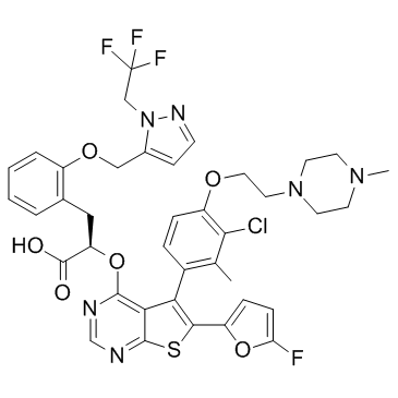 SMILESO=C(O)[C@@H](CC1=C(OCC2=CC=NN2CC(F)(F)F)C=CC=C1)OC3=C4C(SC(C5=CC=C(F)O5)=[C@@]4[C@@]6=C(C)C(Cl)=C(OCCN7CCN(C)CC7)C=C6)=NC=N3