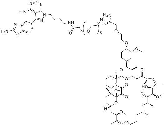 Chemical Name40-O-(2-((1-(32-(4-amino-3-(2-aminobenzo[d]oxazol-5-yl)-1H-pyrazolo[3,4-d]pyrimidin-1-yl)-27-oxo-3,6,9,12,15,18,21,24-octaoxa-28-azadotriacontyl)-1H-1,2,3-triazol-4-yl)methoxy)ethyl)-rapamycin
