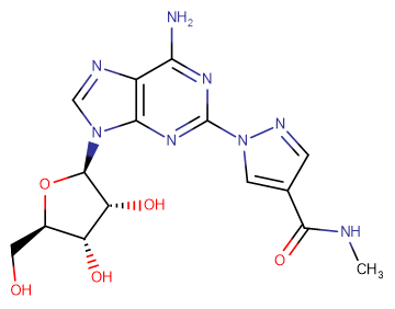 DescriptionRegadenoson is an adenosine derivative and selective A2A adenosine receptor agonist with coronary vasodilating activity. Upon administration, regadenoson selectively binds to and activates the A2A adenosine receptor, which induces coronary vasodilation. This leads to an increase in coronary blood flow and enhances myocardial perfusion. Compared to adenosine, regadenoson has a longer half-life and shows higher selectivity towards the A2A adenosine receptor. This agent is a very weak agonist for the A1 adenosine receptor and has negligible affinity for the A2B and A3 adenosine receptors.