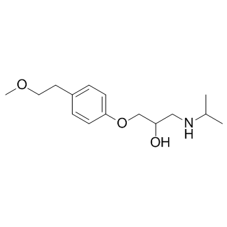 In VivoMetoprolol (2.5 mg/kg/h; infusion; 11 weeks) reduces proinflammatory cytokines and atherosclerosis in ApoE?/? Mice.Metoprolol (15 mg/kg/q12h; i.g.; 5 days) shows anti-inflammation and anti-virus effects in murine model with coxsackievirus B3-induced viral myocarditis.Metoprolol (2.5 mg/kg; i.v.; 3 bolus injections) significantly decreased activated caspase-9 protein expression and inhibits myocardial apoptosis in coronary microembolization (CME) rats. Animal Model:Male ApoE?/? mice Dosage:2.5?mg/kg/h Administration:Via osmotic minipumps, 11 weeks Result:Significantly reduced atherosclerotic plaque area in thoracic aorta, reduced serum TNFα and the chemokine CXCL1 as well as decreasing the macrophage content in the plaques.Animal Model:Balb/c mice, coxsackievirus B3 (CVB3) induced viral myocarditis (VMC) model Dosage:15 mg/kg/q12h Administration:Oral gavage, 5 consecutive days Result:Reduced pathological scores of VMC induced by CVB3 infection, protected the myocardium against viral damage by reducing serum cTn-I levels. Decreased the levels of myocardial pro-inflammatory cytokines and increase the expression of anti-inflammatory cytokine. Significantly decreased myocardial virus titers.