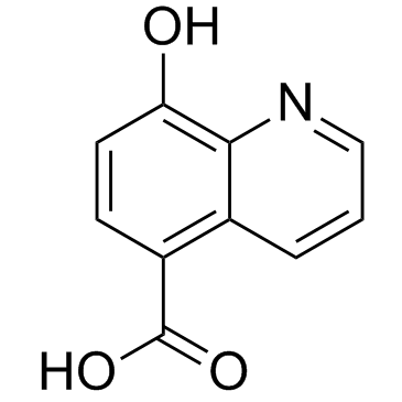 DescriptionIOX1 is a potent, broad-spectrum inhibitor of 2OG oxygenases, including the JmjC demethylases, with IC50 of <1 uM gainst the KDM3, KDM4 and KDM6, 5-25 uM against the KDM5 and KDM2/7; IOX1 is less potent against BBOX1 (IC50=196 uM); chelates to Fe(II) in the active site of 2OG oxygenases; suppresses the proliferation and migration of vascular smooth muscle cells induced by angiotensin II.