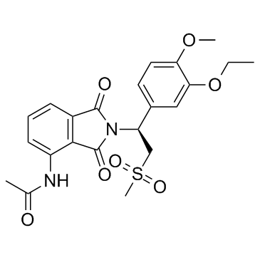 DescriptionApremilast (CC-10004) is a potent, orally active PDE4 inhibitor with IC50 of 74 nM, inhibits TNF-α production in LPS-stimulated hPBMCs with IC50 of 77 nM; inhibits PBMC production of the chemokines CXCL9 and CXCL10, IFN-gamma and TNF-alpha, and IL-2, IL-12 and IL-23, also inhibits TNF-α by NK cells and keratinocytes; significantly reduces epidermal thickness and proliferation, decreases the general histopathological appearance of psoriasiform features and reduces expression of TNF-α, human leukocyte antigen-DR and intercellular adhesion molecule-1 in the lesioned skin in model of psoriasis.Psoriasis Approved(In Vitro):Apremilast (CC-10004) inhibits TNF-α release by lipopolysaccharide (LPS) with an IC50 of 104 nM (pIC50=6.98±0.2), which almost exactly replicates previous reported TNF-α inhibition by Apremilast on peripheral blood mononuclear cells (PBMCs) (IC50=110 nM) and which is similar to the potency of Apremilast for PDE4 enzymatic inhibition (IC50=74 nM). These results are clearly consistent with the hypothesis that Apremilast inhibits TNF-α by increasing intracellular cAMP levels. PKA, Epac1 and Epac2 knockdowns prevented TNF-α inhibition and IL-10 stimulation by Apremilast. (In Vivo):Apremilast (CC-10004), orally administered (5 mg/kg), significantly inhibits TNF-α production in the air pouch by 39 % (61±6 % of vehicle, P <0.001) and diminishes (by 28 %) the number of leukocytes present (72±12 % of vehicle, P<0.05). In agreement, immunohistologic analysis shows that neutrophil accumulation in the air pouch membrane is dramatically reduced by Apremilast. In the murine air pouch model, both Apremilast and methotrexate (MTX) significantly inhibit leukocyte infiltration, while Apremilast, but not MTX, significantly inhibits TNF-α release. The addition of MTX (1 mg/kg) to Apremilast (5 mg/kg) yields no more inhibition of leukocyte infiltration or TNF-α release than with Apremilast alone.Apremilast is a novel, oral PDE4 inhibitor that has been shown to regulate inflammatory mediators. After oral administration of Apremilast, a mean maximum plasma concentration (Cmax) is found to be 67.00±14.87 ng/mL. The plasma concentration of Apremilast decreases rapidly and is eliminated from plasma with a terminal half-life of 0.92±0.46 h.