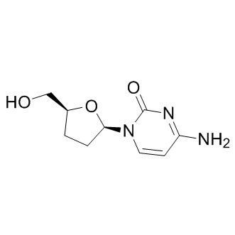 DescriptionA pyrimidine analog reverse transcriptase inhibitor (NRTI) for the treatment of HIV/AIDS; also incorporates into the viral DNA, hence terminating the chain elongation due to the missing hydroxyl group; highly oral activity.HIV Infection Approved(In Vitro):Zalcitabine is a dideoxynucleoside antiretroviral agent that is phosphorylated to the active metabolite 2',3'-dideoxycytidine 5'-triphosphate (ddCTP) within both uninfected and HIV-infected cells. At therapeutic concentrations, ddCTP inhibits HIV replication by inhibiting the enzyme reverse transcriptase and terminating elongation of the proviral DNA chain. Zalcitabine exhibits the inhibition effect on the cellular uptake of [3H]-PAH in CHO/hOAT1 cells with an IC50 value of 1.23 mM. Furthermore, the cellular uptake of zalcitabine increased threefold with the enhancement of hOATI activity in CHO/hOAT1 cells.