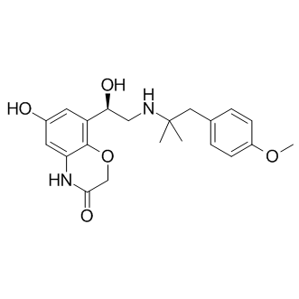 DescriptionA potent, selective long-acting β2 adrenoceptor agonist with EC50 of 1.4 nM for hβ2; shows >250 fold selectivity over hβ1; exerts a bronchodilatory efficacy over 24 h in dogs and guinea pigs in the absence of systemic pharmacodynamic effects.COPD Phase 3 Clinical(In Vitro):Olodaterol (0.001~10 nM; fibroblasts) attenuates growth factor-induced motility and proliferation.Olodaterol (0.1~10 nM; fibroblasts) interferes with FGF-induced phosphorylation of signalling cascades.Olodaterol (0.001~1000 nM; 30 minutes; fibroblasts) increases intracellular cAMP in a concentration-dependent manner. Olodaterol (0~10 nM; 30 minutes; fibroblasts) concentration-dependently inhibits the PICP increase with maximal efficacy of 70 % at 10 nM. Olodaterol has a subnanomolar affinity for the β2-AR (pKi=9.14) and is selective for this receptorin comparison with the β1-AR and β3-AR subtypes.(In Vivo):Olodaterol (1 mg/kg; inhal.; 21 days) accelerats body weight recovery back to control levels (at day 21) and attenuats TGF-β-induced lung fibrosis.Olodaterol (0.1~3 μg/kg; inhal.; 5 hours) induces a dose-dependent bronchoprotection.Olodaterol (0.3 and 0.6 μg/kg; inhal.; 24 hours) induces a maximal bronchoprotection of approximately 60 % after 0.5 hours.