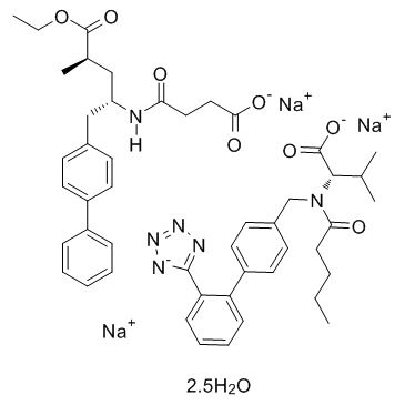 DescriptionA novel single molecule comprising molecular moieties of valsartan and NEP inhibitor prodrug AHU377 (1:1 ratio); causes dose-dependent increases in atrial natriuretic peptide immunoreactivity (due to NEP inhibition) in Sprague-Dawley rats and provides sustained, dose-dependent blood pressure reductions in hypertensive double-transgenic rats; orally active.Heart Failure Approved(In Vitro):Sacubitril/Valsartan (LCZ696; 1-30 μM; 0.5 hours) inhibits HG-treated H9C2 cells apoptosis in an experimental model of Diabetic cardiomyopathy (DCM).Sacubitril/Valsartan (1-30 μM; 0.5 hours) increases the expression level of cleaved caspase-3 and the ratio of Bax/Bcl-2 in HG-treated H9C2 cells.(In Vivo):Sacubitril/Valsartan (LCZ696; perorally; 68 mg/kg for 4 weeks) significantly exhibits small weights and reduces interstitial fibrosis both in the noninfarct zone and peri-infarct zone.