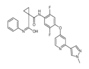 SMILESCn1cc(cn1)c1nccc(c1)Oc1c(cc(c(c1)F)NC(=O)C1(CC1)C(=O)Nc1ccccc1)F