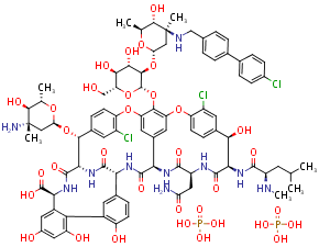 SMILESO[C@@H]1[C@@H](O[C@@H]2O[C@@H](C)[C@H](O)[C@@](C2)(C)NCc2ccc(c3ccc(Cl)cc3)cc2)[C@@H](O[C@H](CO)[C@H]1O)Oc1c2Oc3ccc([C@H]([C@@H](NC(=O)[C@H](NC)CC(C)C)C(=O)N[C@H](C(=O)N[C@@H]4c(c2)cc1Oc1ccc([C@H]([C@H]2C(=O)N[C@H](C(=O)O)c5c(c6cc([C@@H](NC4=O)C(=O)N2)ccc6O)c(O)cc(O)c5)O[C@@H]2O[C@@H](C)[C@H](O)[C@](C2)(N)C)cc1Cl)CC(=O)N)O)cc3Cl.O=P(O)(O)O.O=P(O)(O)O