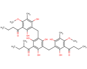 SMILESCCCC(=O)C1=C(C(=C(C(=C1O)CC2=C(C(=C(C(=C2O)C(=O)C(C)CC)O)CC3=C(C(=C(C(=C3O)C)OC)C(=O)CCC)O)O)O)C)OC