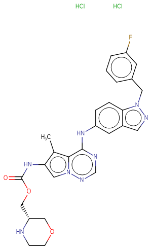 SMILESCl.Cl.Cc1c(NC(=O)OC[C@@H]2COCCN2)cn2ncnc(Nc3ccc4n(Cc5cccc(F)c5)ncc4c3)c12