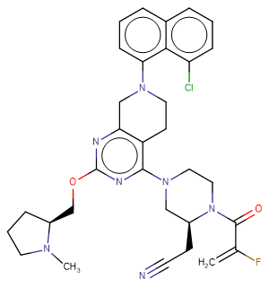 In VitroCell Viability Assay Cell Line:MIA PaCa-2, H1373, H358, H2122, SW1573, H2030, KYSE-410 cells (G12C); H1299 (WT); A549 (G12S), HCT116 (G13D) cellsConcentration:0.1, 1, 10, 100, 1000, 10000 nM Incubation Time:24 hours Result:Inhibits cell growth in the vast majority of KRAS G12C-mutant cell lines with IC50 values ranging between 10 and 973 nM in the 2D format and between 0.2 and 1042 nM in the 3D format.Western Blot AnalysisCell Line:MIA PaCa-2 cells Concentration:0.24, 0.5, 1.0, 2.0, 3.9, 7.8, 15.6, 31.3, 62.5, 125, 250, 500, 1000 nM Incubation Time:24 hours Result:Inhibits KRAS-dependent signaling targets including ERK1/2 phosphorylation (Thr202/Tyr204 ERK1; pERK), S6 phosphorylation (RSK-dependent Ser235/236; pS6) and expression of the ERK-regulated DUSP6, each with IC50s in the single-digit nanomolar range in cell lines.