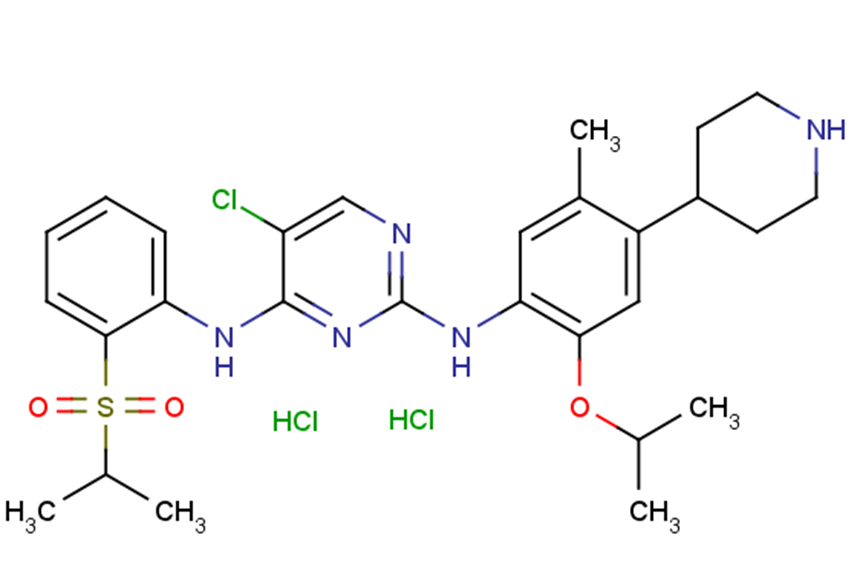 Ceritinib dihydrochloride is a selective, orally bioavailable and ATP-competitive inhibitor of ALK tyrosine kinase(IC50 of 200 pM), and also inhibits IGF-1R, InsR, and STK22D (IC50 values of 8, 7, and 23 nM, respectively).