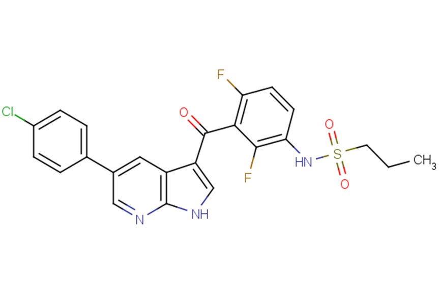 PLX-4032 is a small-molecule B-Raf inhibitor for the potential treatment of malignant melanoma.PLX-4032 and its related analogs are highly potent inhibitors of B-Raf activity, with 3-fold selectivity for the V600E mutation over the wild-type kinase.