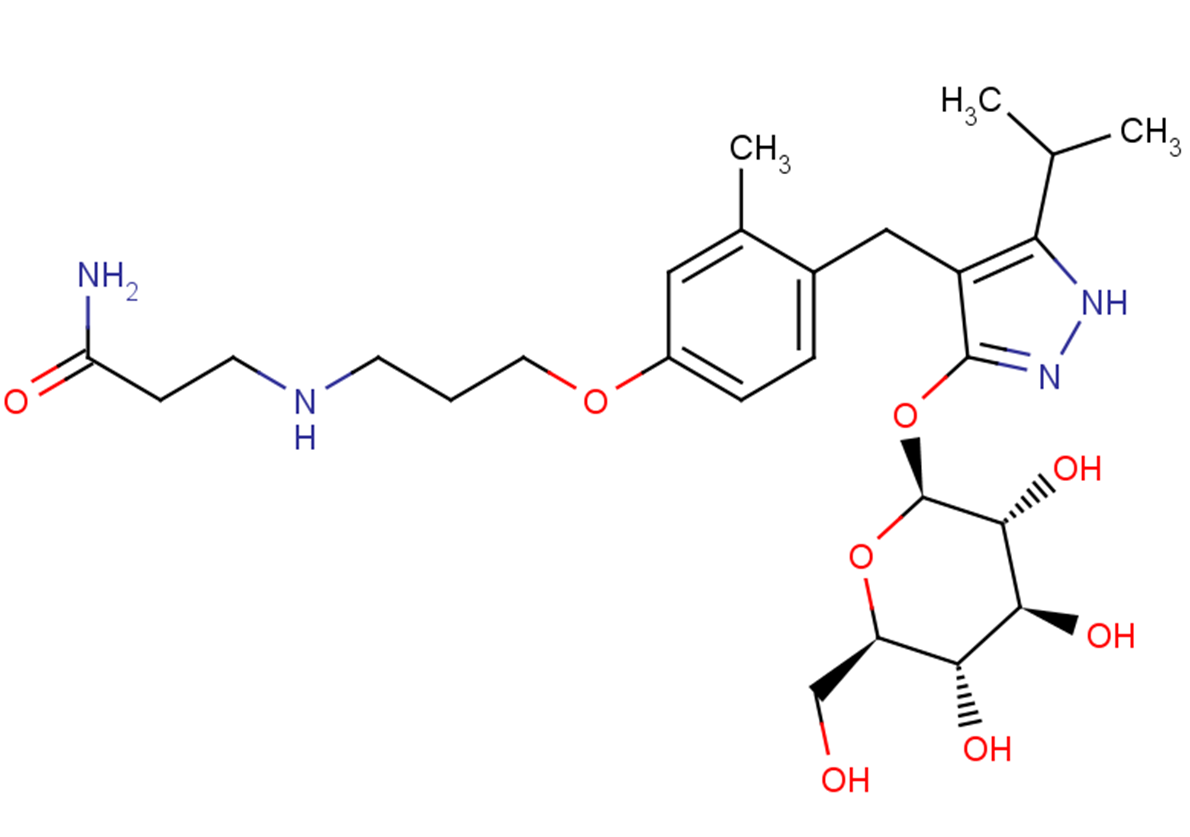 DescriptionKGA-2727 is a potent and selective SGLT1 inhibitor, with Kis of 97.4 nM and 43.5 nM for human and rat SGLT1, respectively. The selectivity ratios (Ki for SGLT2/Ki for SGLT1) of KGA-2727 are 140 (human) and 390 (rat). KGA-2727 for the treatment of diabete.KGA-2727, which has a pyrazole-O-glucoside structure, as the first selective SGLT1 inhibitor. KGA-2727 inhibited SGLT1 potently and highly selectively in an in vitro assay using cells transiently expressing recombinant SGLTs.KGA2727 dose-dependently inhibits Methyl-Dglucopyranoside (AMG) uptake by SGLT1 and SGLT2. A Dixon plot analysis for KGA-2727 shows good linearity for human SGLT1 and SGLT2. KGA-2727 inhibits these SGLTs in a competitive manner displayed from the results of the Dixon plot.In a small intestine closed loop absorption test with normal rats, KGA-2727 inhibited the absorption of glucose but not that of fructose. After oral intake of starch along with KGA-2727 in normal rats, the residual content of glucose in the gastrointestinal tract increased. In the oral glucose tolerance test with streptozotocin-induced diabetic rats, KGA-2727 attenuated the elevation of plasma glucose after glucose loading, indicating that KGA-2727 improved postprandial hyperglycemia. In Zucker diabetic fatty (ZDF) rats, chronic treatments with KGA-2727 reduced the levels of plasma glucose and glycated hemoglobin. Furthermore, KGA-2727 preserved glucose-stimulated insulin secretion and reduced urinary glucose excretion with improved morphological changes of pancreatic islets and renal distal tubules in ZDF rats. In addition, the chronic treatment with KGA-2727 increased the level of glucagon-like peptide-1 in the portal vein.