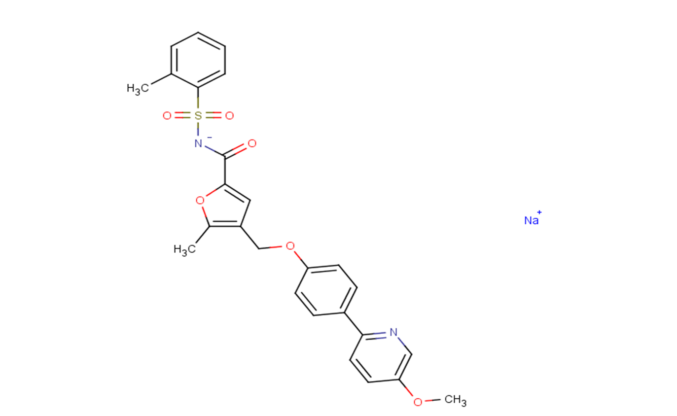 SMILESCC1=CC=CC=C1S(=O)(=O)[N-]C(=O)C2=CC(=C(O2)C)COC3=CC=C(C=C3)C4=NC=C(C=C4)OC.[Na+]