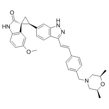 SMILESC[C@@H]1CN(C[C@@H](O1)C)CC2=CC=C(C=C2)/C=C/C3=NNC4=C3C=CC(=C4)[C@@H]5C[C@]56C7=C(C=CC(=C7)OC)NC6=O