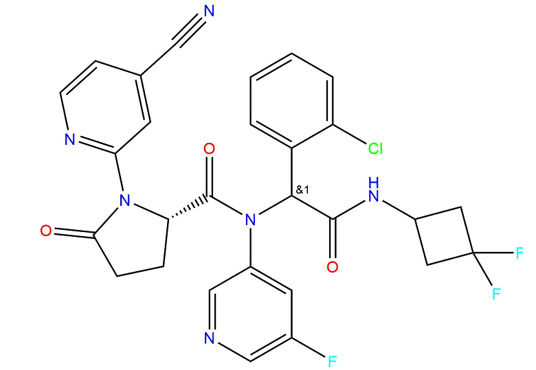 SMILESO=C1CC[C@@H](C(N(C(C(NC2CC(F)(F)C2)=O)C3=CC=CC=C3Cl)C4=CC(F)=CN=C4)=O)N1C5=NC=CC(C#N)=C5