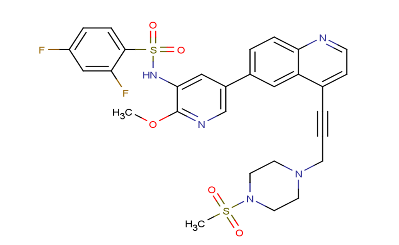 SMILESFC1=CC(F)=CC=C1S(=O)(NC2=CC(C3=CC=C(N=CC=C4C#CCN5CCN(S(C)(=O)=O)CC5)C4=C3)=CN=C2OC)=O