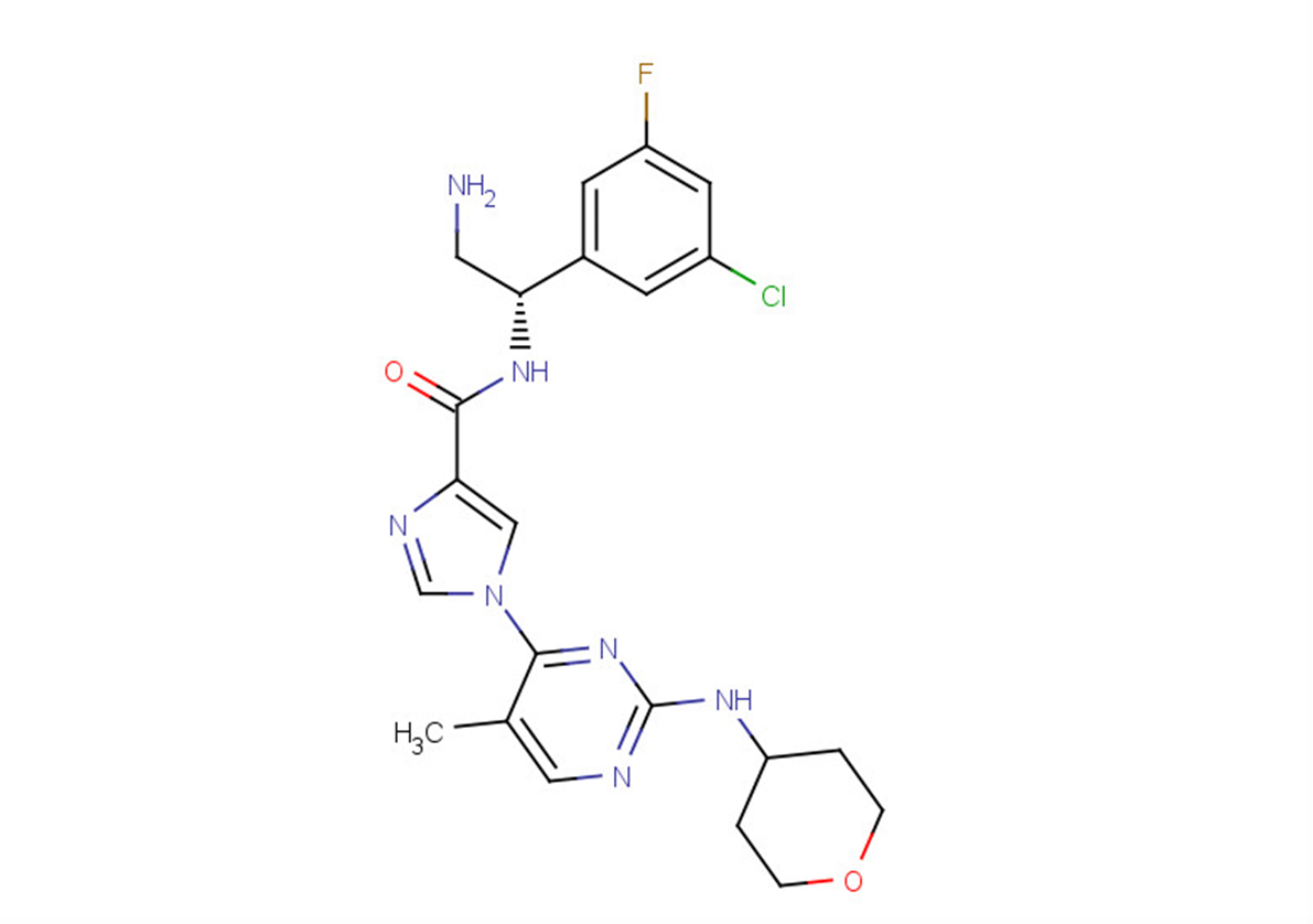SMILESO=C(C1=CN(C2=NC(NC3CCOCC3)=NC=C2C)C=N1)N[C@@H](C4=CC(F)=CC(Cl)=C4)CN