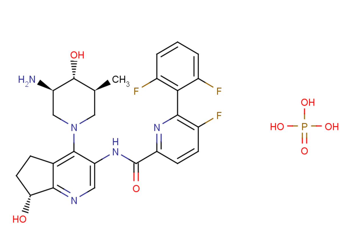 SMILESO=C(C1=NC(C2=C(F)C=CC=C2F)=C(F)C=C1)NC3=CN=C4C(CC[C@H]4O)=C3N5C[C@@H](N)[C@H](O)[C@@H](C)C5.O=P(O)(O)O