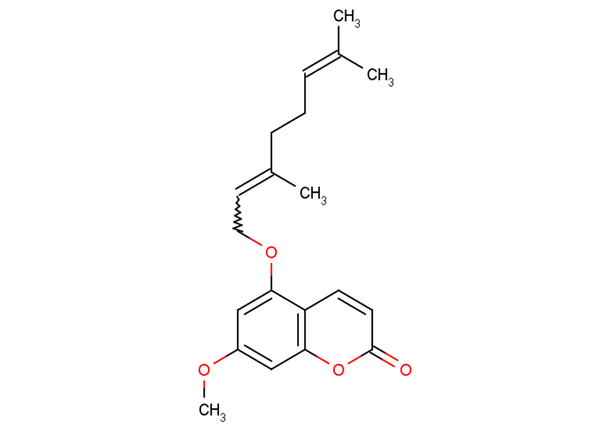 In Vitro5-Geranoxy-7-methoxycoumarin (12.5-200 μM; 24-72 hours) induces a significant inhibition of cell growth in a time-dependent manner in SW480 cells.5-Geranoxy-7-methoxycoumarin (50 μM;48 hours) promotes DNA fragmentation and causes apoptosis through inhibition of the p38 MAPK signaling pathway in SW480 cells.5-Geranoxy-7-methoxycoumarin (50 μM; 24-48 hours) increases the percentage of cells in the sub G1/G0 phase from 5.3% (in control cells) to 18% after 48 h incubation.Cell Proliferation Assay Cell Line:SW480 Concentration:0-20 μM Incubation Time:24, 48 and 72 hours Result:Inhibited cell growth by 67% at 72 hours.Apoptosis Analysis Cell Line:SW480 cells Concentration:50 μM Incubation Time:48 hours Result:Induced cell apoptosis.Cell Cycle Analysis Cell Line:SW480 cells Concentration:50 μM Incubation Time:48 hours Result:Inhibited cell cycle progression in vitro.