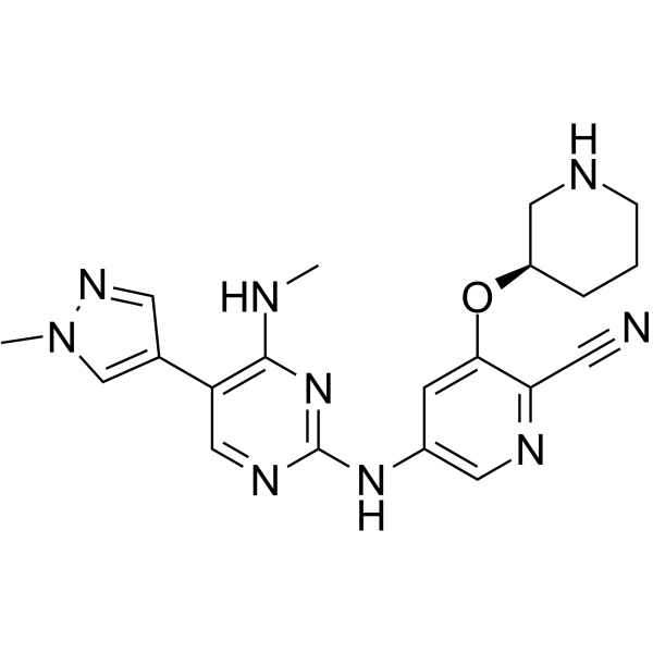 SMILESCNc1nc(Nc2cnc(C#N)c(O[C@@H]3CCCNC3)c2)ncc1-c1cnn(C)c1