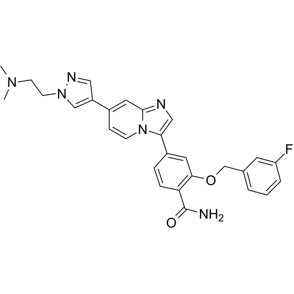 SMILESCN(C)CCn1cc(cn1)-c1ccn2c(cnc2c1)-c1ccc(C(N)=O)c(OCc2cccc(F)c2)c1