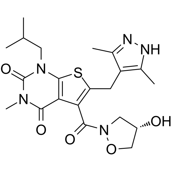SMILESCC(C)Cn1c2sc(Cc3c(C)n[nH]c3C)c(C(=O)N3C[C@H](O)CO3)c2c(=O)n(C)c1=O