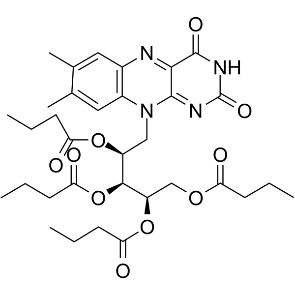 DescriptionRiboflavin Tetrabutyrate is a lipophilic flavin derivative. Riboflavin Tetrabutyrate has antioxidative and lipid peroxide-removing activity.(In Vitro):Riboflavin Tetrabutyrate is suppressive against both NADPH-coupled and ascorbate-induced microsomal lipid peroxidation. Riboflavin Tetrabutyrate inhibits oxygen uptake by lipid peroxidation. Riboflavin Tetrabutyrate seems to exhibit its antioxidative action at or after the hydrogen atom is abstracted as a free radical from an active methylene group of polyunsaturated fatty acids during the process of enzymic oxidation-reduction reaction .(In Vivo):Riboflavin Tetrabutyrate might improve the metabolism of lipids in patients suffering from atherosclerosis, diabetes, fatty liver, and so on through the inhibition of lipid peroxide, resulting in a decrease of the elevated serum lipid. The increase in hepatic 3-ketoacyl-CoA thiolase activity suggests that prolonged Riboflavin Tetrabutyrate administration induces an increased beta-oxidation of fatty acid in the liver. Feeding of Riboflavin Tetrabutyrate causes an increase in the hepatic activity of 3-ketoacyl-CoA thiolase by 50% of the control level, while the activities of renal 3-ketoacyl-CoA thiolase and of hepatic and renal acyl-CoA synthetase and acyl-CoA dehydrogenase remain unaffected .