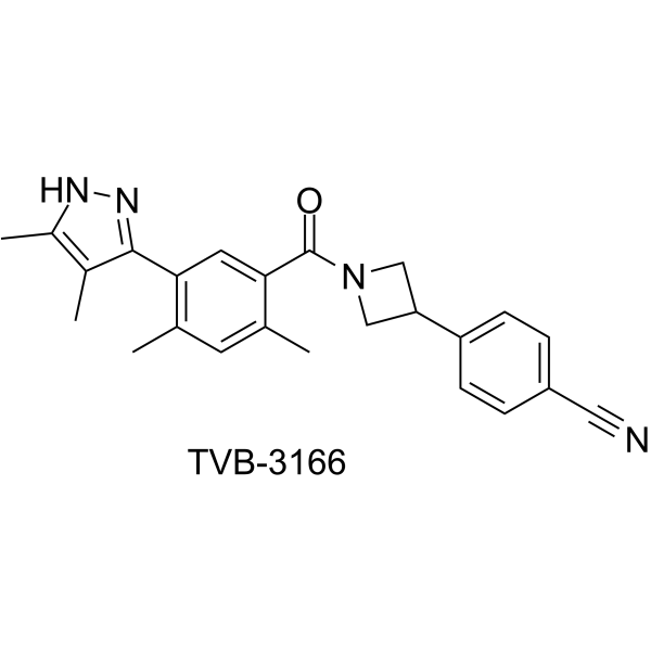 DescriptionTVB-3166 induces apoptosis and inhibits in-vivo xenograft tumor growth. TVB-3166 is a reversible and selective fatty acid synthase inhibitor (IC50s: 42 nM and 81 nM for biochemical FASN and cellular palmitate synthesis, respectively).(In Vitro):TVB-3166 (0.2 μM; 48 hours) inhibits β-catenin pathway signal transduction and transcriptional activity. TVB-3166 (0.02 or 0.20 μM; 7 days) suppresses palmitate synthesis and tumor cell viability in a dose-dependent manner. TVB-3166 (0.001-10 μM; 24 hours) induces cell death in CALU-6 non-small-cell lung tumor cells (cellular IC50: 0.10 μM) . (In Vivo):TVB-3166 (Oral gavage; 30-100 mg/kg/day) has the concentration is approximately 3-fold higher in plasma than the tumor. TVB-3166 (Oral gavage; 30-100 mg/kg/day) inhibits xenograft tumor growth. The 100 and 30 mg/kg groups had plasma and tumor concentrations of 7 and 2.9 μM, respectively .